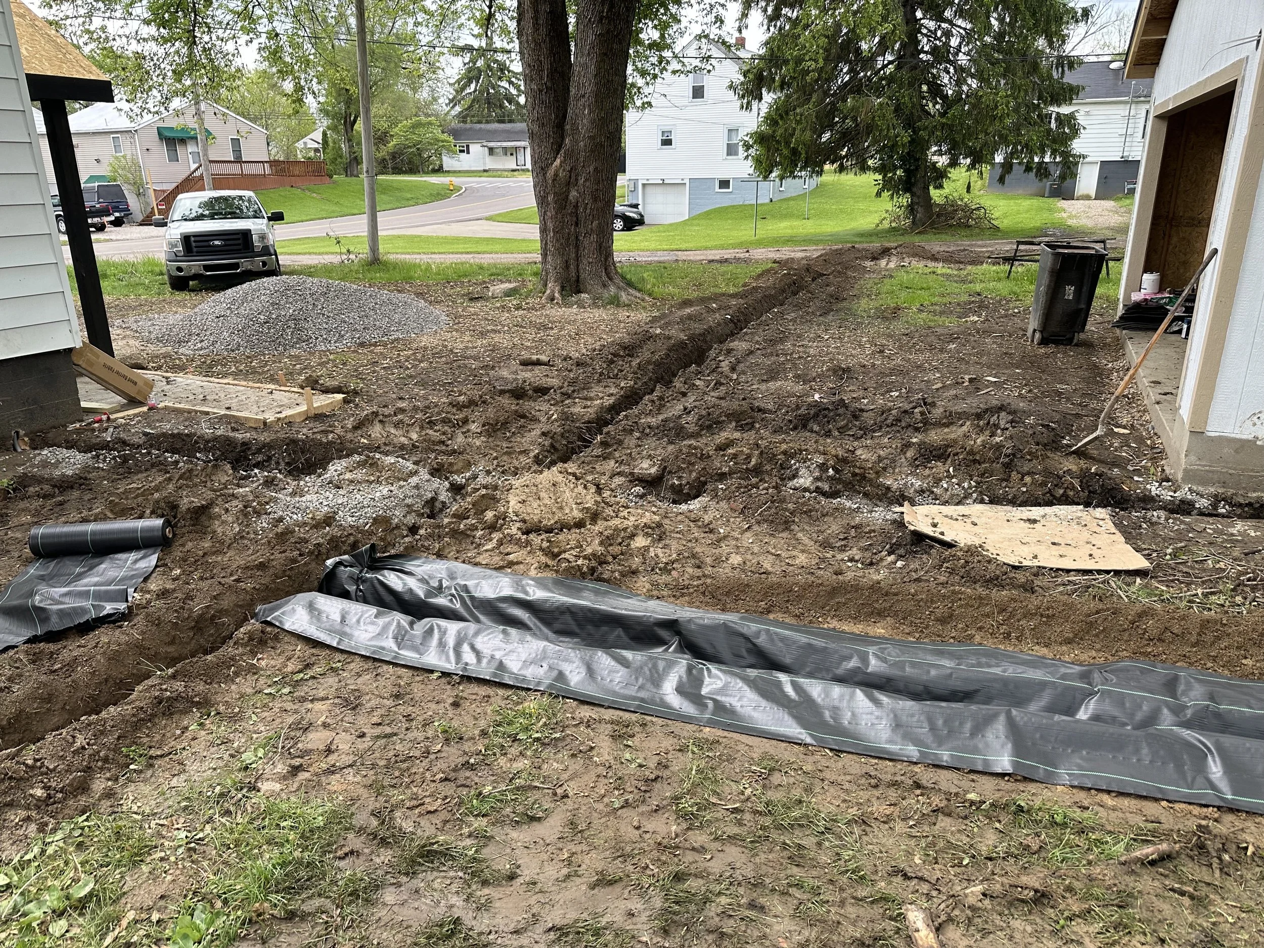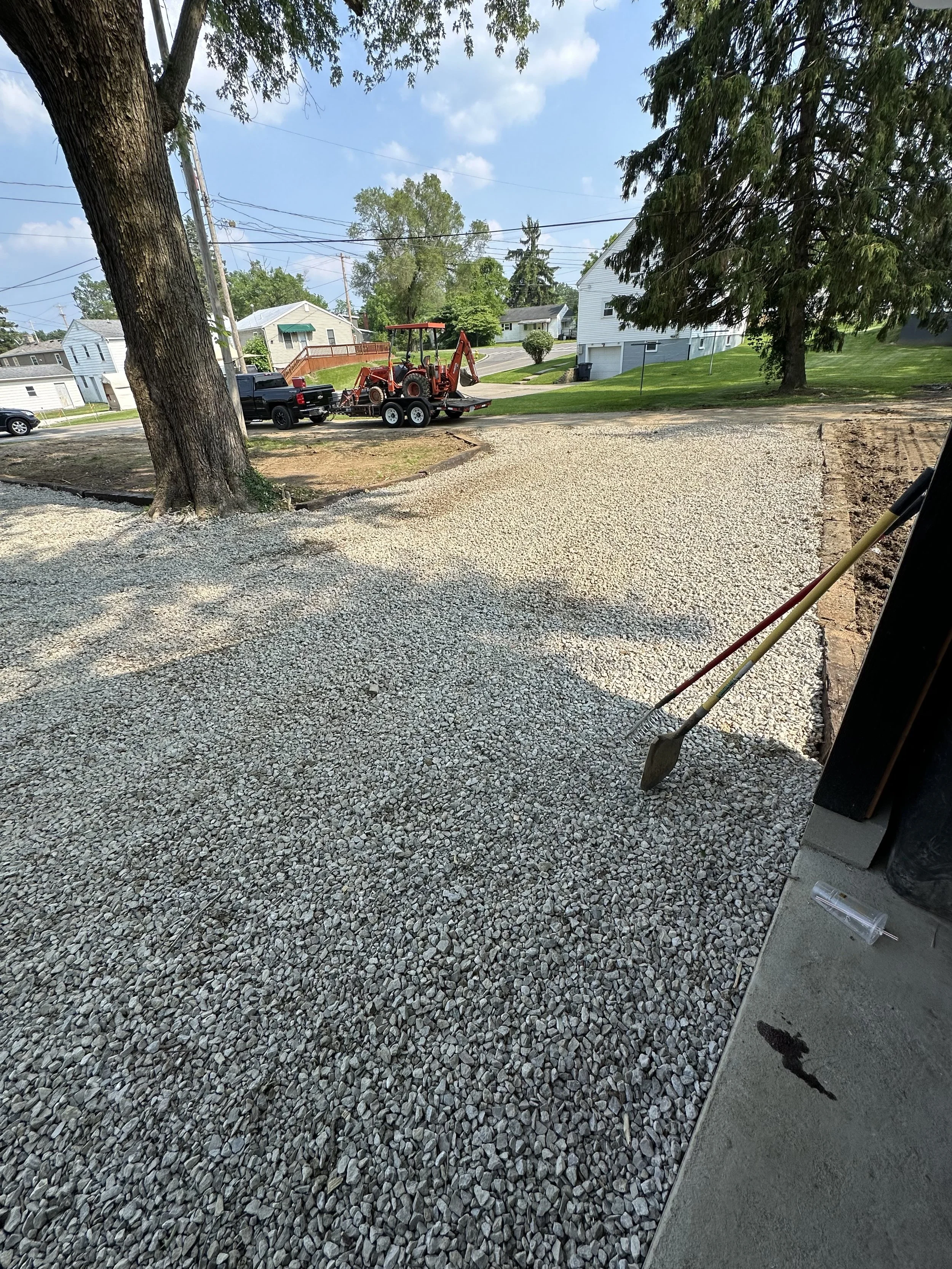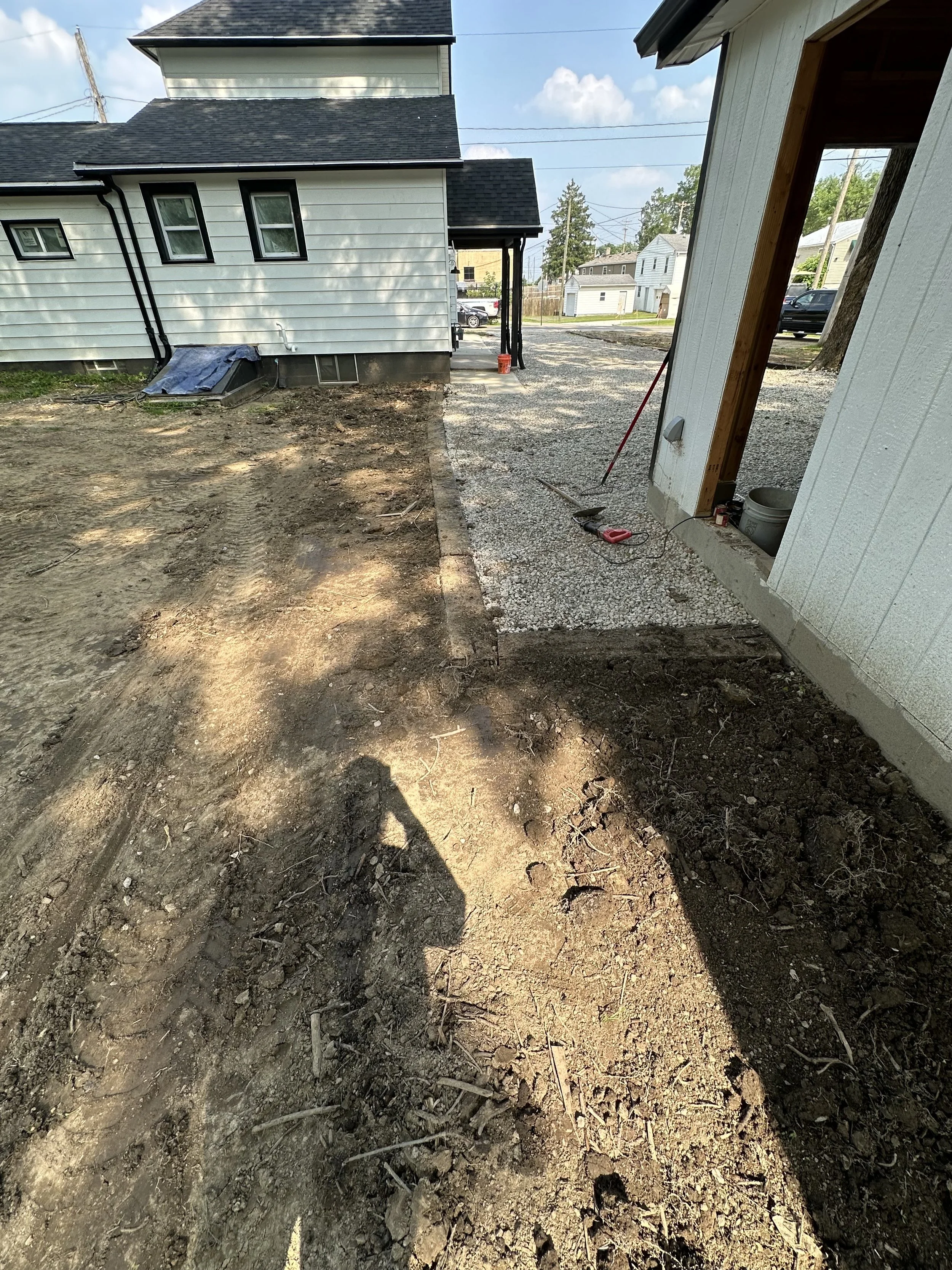 Stripped topsoil and regraded the drive path to ensure proper drainage and slope away from the home and garage. Dug and installed trenching for downspout and foundation runoff control, incorporating drainage fabric and stone for long term performance. Laid and compacted multiple loads of limestone gravel for a durable, clean, and level driveway that ties into the garage, side entrance, and parking area. Clean up, compaction, and edge definition to ensure a tidy, professional final appearance.
